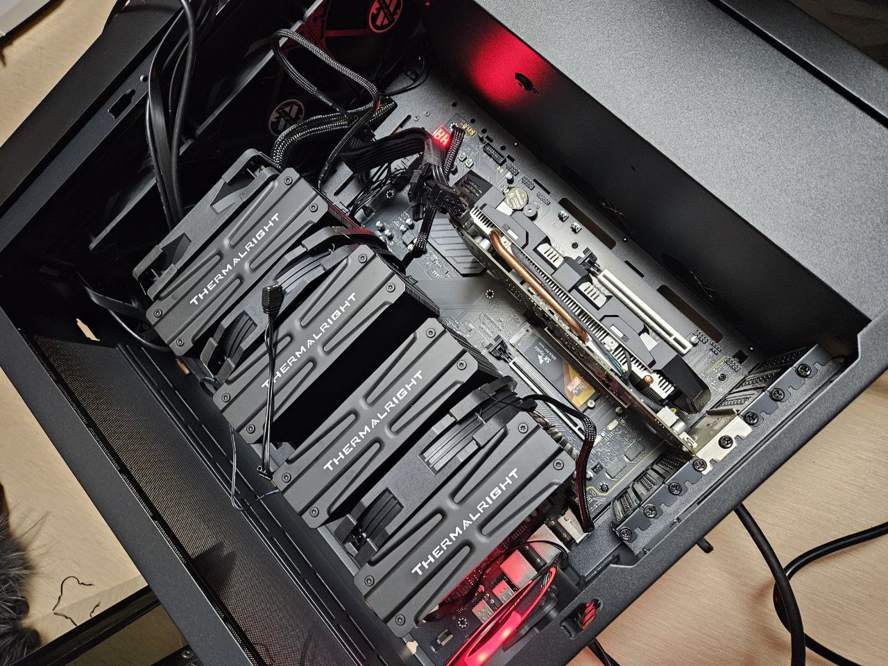 요것도 저소음으로 알아봐서 산거라 나름 나쁘진 않은데 써멀라이트 쿨러 제품이 중간에 낀 쿨링팬과 앞의 쿨링팬의 사이즈가 다르다